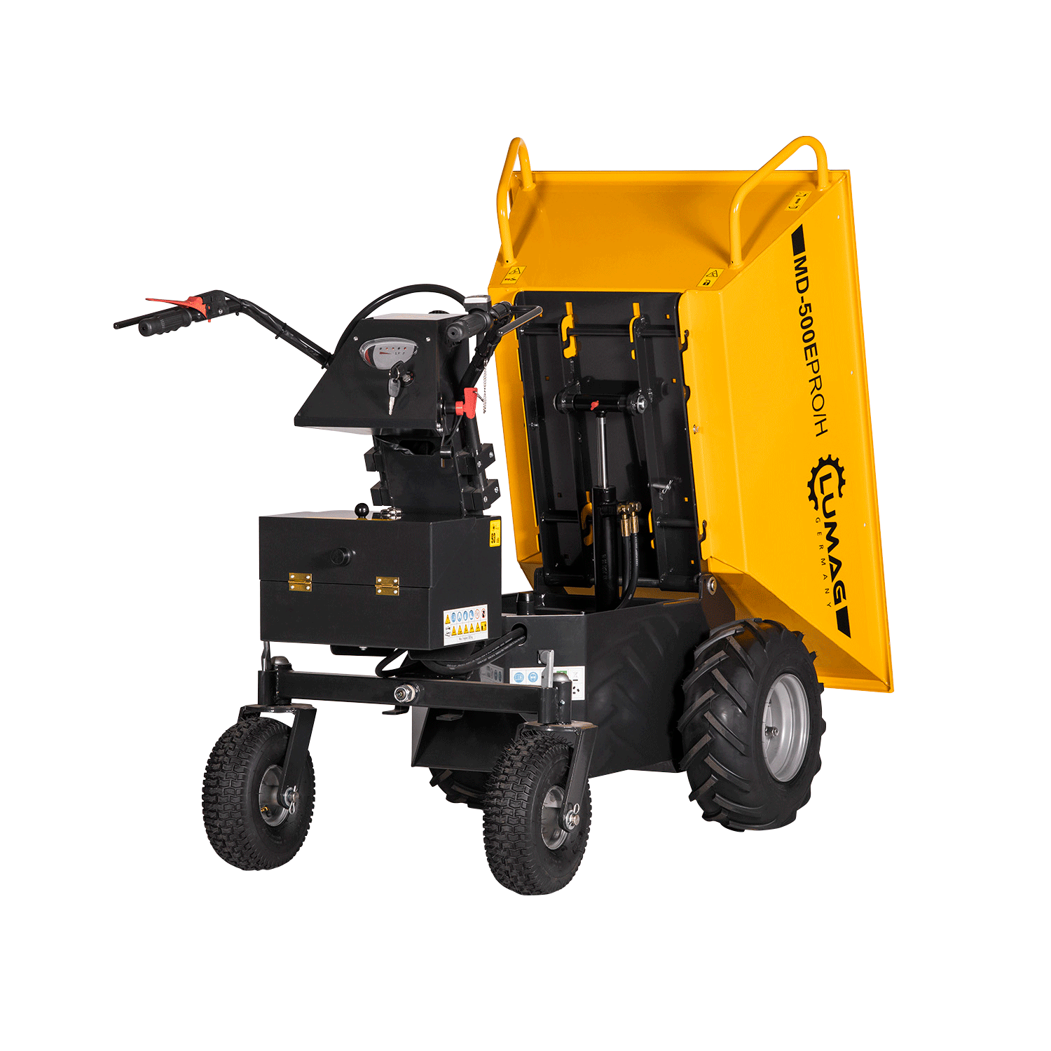 Der Elektro-Raddumper MD500E PRO-H ist ein emissionsfreier und wartungsarmer Transporthelfer für Baustelle, Garten- und Landschaftsbau. Dank hydraulischer Kippfunktion und stabilem Fahrgestell lassen sich Schüttgüter wie Erde, Kies, Sand oder Bauschutt mühelos aufnehmen, transportieren und entladen. Die elektrische Antriebstechnik sorgt für leisen Betrieb, hohe Effizienz und hohe Alltagstauglichkeit – auch in engen oder empfindlichen Bereichen.